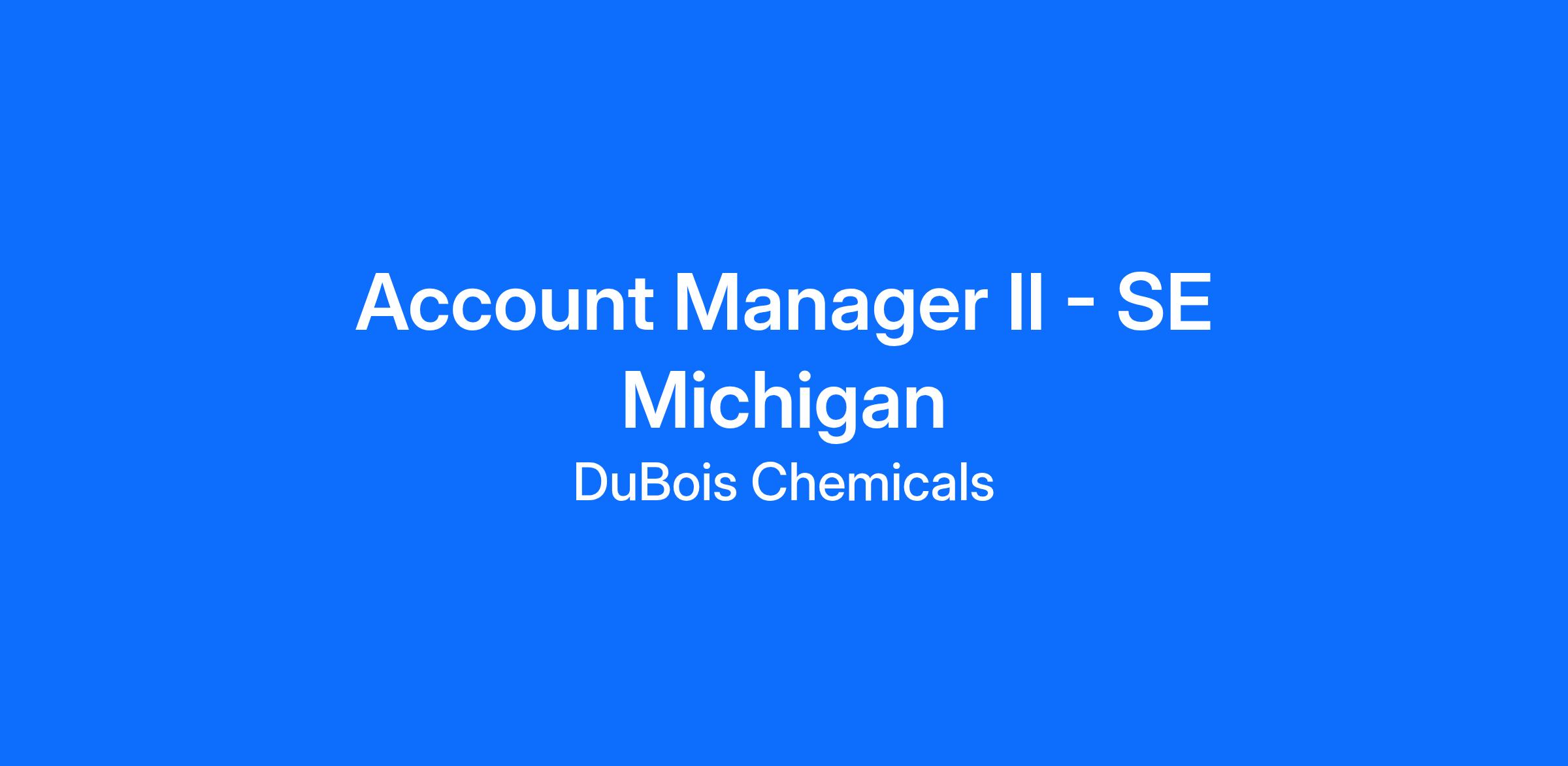 DuBois Chemicals is looking for a high-performing Account Manager II to support our Southeastern Michigan territory. Responsible to develop long-term relationships with a portfolio of customers, provide expert technical support, and customer satisfaction. Primary contact point between company and its diverse client base. Function as the liaison between customers and cross-functional internal teams to ensure the timely and successful delivery of our solutions according to customer needs. Demonstrate the company’s core competencies of communication, customer focus, innovation, integrity & ethics, lean & safety, and passion to succeed.