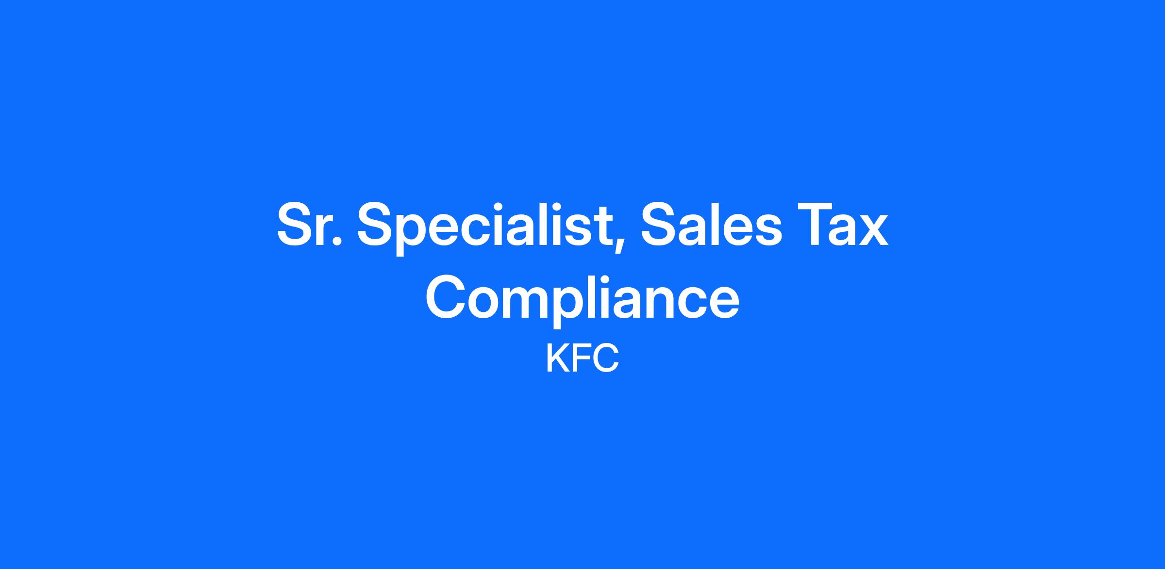 DescriptionJoin Yum! Brands as a Sr. Specialist, Sales Tax Compliance where you’ll collaborate with cross-functional teams including Shared Services (Tax Compliance, AP, AR, Lease, and Project Costing), Corporate Tax, Brand Legal, Development, Payroll Tax, Brand Reporting, and Finance. In this role, you’ll also work closely with third-party vendors, state and local taxing authorities, and business licensing offices. The Sr. Specialist provides outstanding customer service while partnering with all levels of the organization, as well as external suppliers and service providers. This is a Louisville, KY based remote position.