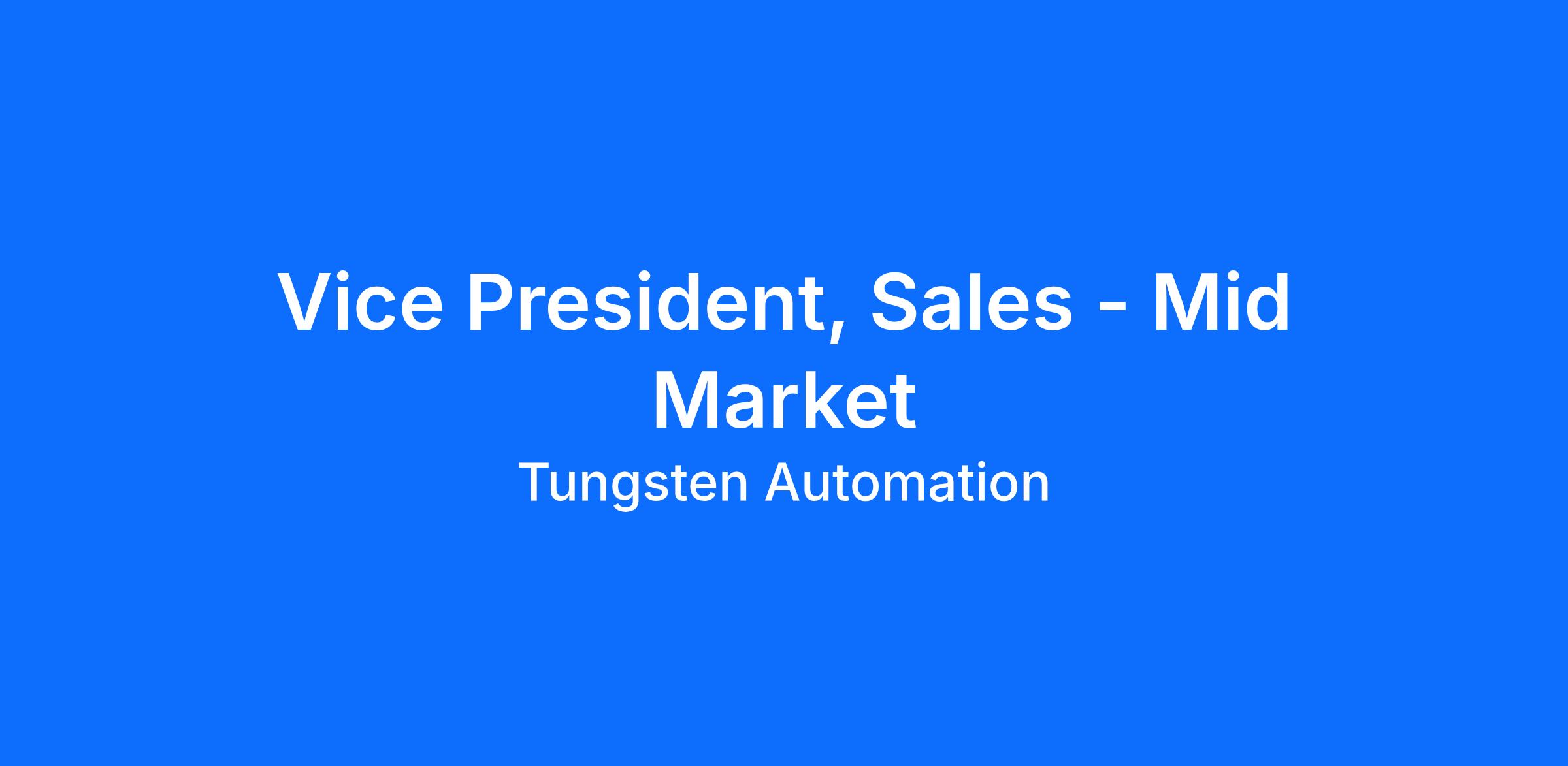 The Vice President, Sales – Mid Market will build and lead a high-growth software sales team responsible for selling Tungsten Automation’s Intelligent Automation software platform to mid-market customers. This role will focus on transforming information-intensive business processes for customers, reducing manual work and errors, minimizing costs, and improving customer engagement while driving consistent quarterly revenue across the region. The leader in this role will be both strategic and operational, ensuring a strong pipeline, operational excellence, and a high-performing sales culture across the team.